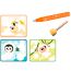 Un feuillet avec les tableaux finis peut servir de modèle à l'enfant. Grâce à son feutre et son tampon, il colorie et trace des motifs et il peut aussi tapoter avec son doigt, pour faire apparaître comme par magie les images et les couleurs qui disparaissent ensuite en séchant. Il peut recommencer à l'infini !